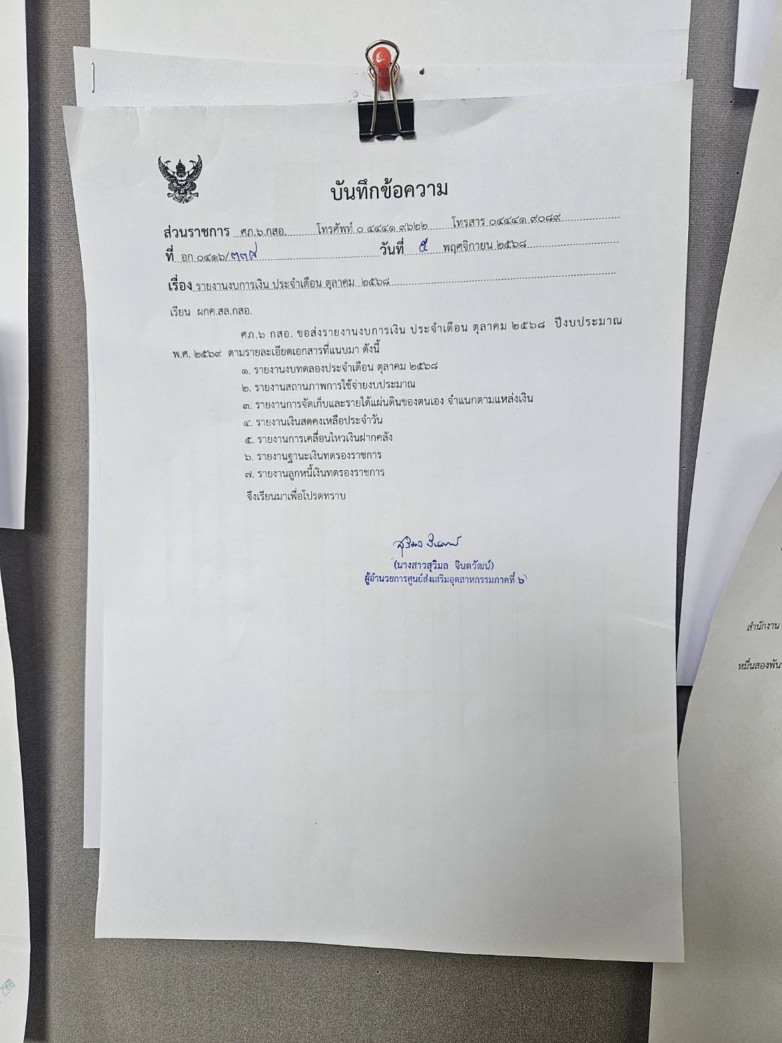 รายงานงบการเงินประจำเดือน ตุลาคม 2568